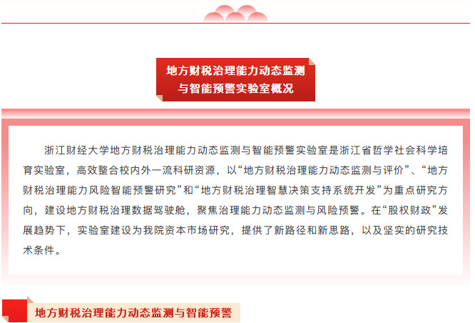 浙江财经大学地方财税治理能力动态监测与智能预警实验室(以下简称“实验室”)于2024年12月入选浙江省哲学社会科学培育实验室,是我校重点建设的省级学科平台。